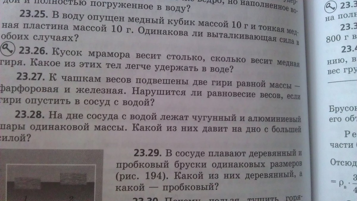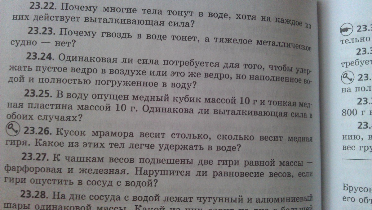 23.27. Да нарушится. Плотность фарфора меньше плотности железа. Значит объем фарфоровой гири больше объема гири железной. Следовательно фарфоровая гиря вытеснит больше воды, чем железная. Значит выталкивающая сила действующая на форфоровую гирю будет больше чем выталкивающая сила действующая на железную Поэтому фоарфоровая гиря в воде станет весить меньше, чем железная.