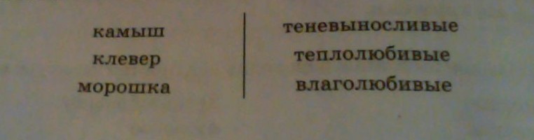 Камыш влаголюбивые, морошка теневыносливая, клевер теплолюбивые, дыня светолюбивые, верблюжья колючка засухоустойчивые.
