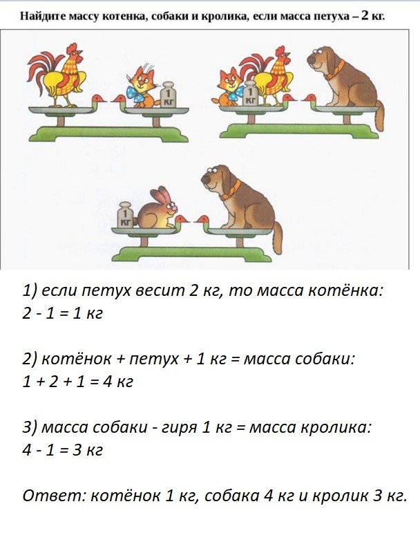 найди массу в килограммах котенка, собаки и кролика, если масса петуха - 2 кг.