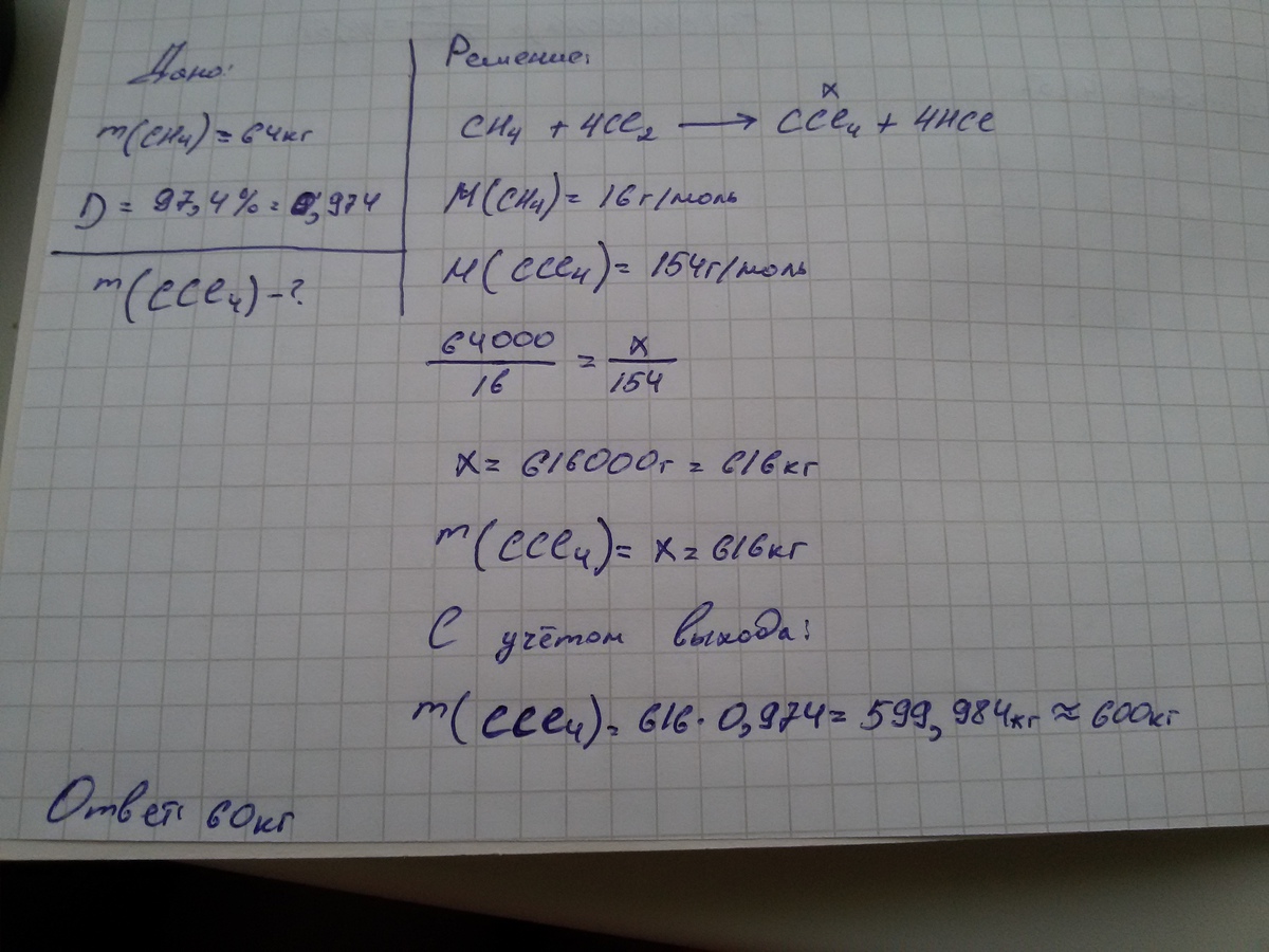 Масса (кг ) тетрахлорметана, полученного из 64 кг метана с практическим выходом 97,4 %, составляет?