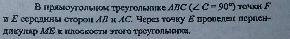 Отрезок EF является средней линией прямоугольного треугольника ABC (ACB=90°). Через точку E проведен перпендикуляр ME к плоскости этого треугольника.