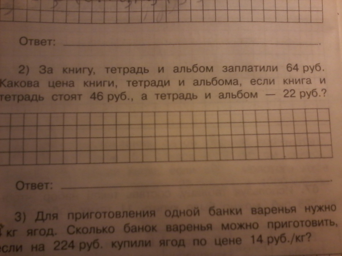 за книгу тетрадь и альбом заплатили 64 руб.какова цена книги тетради и альбома если книга и тетрадь стоят 46 руб., а тетрадь и альбом 22 руб.?