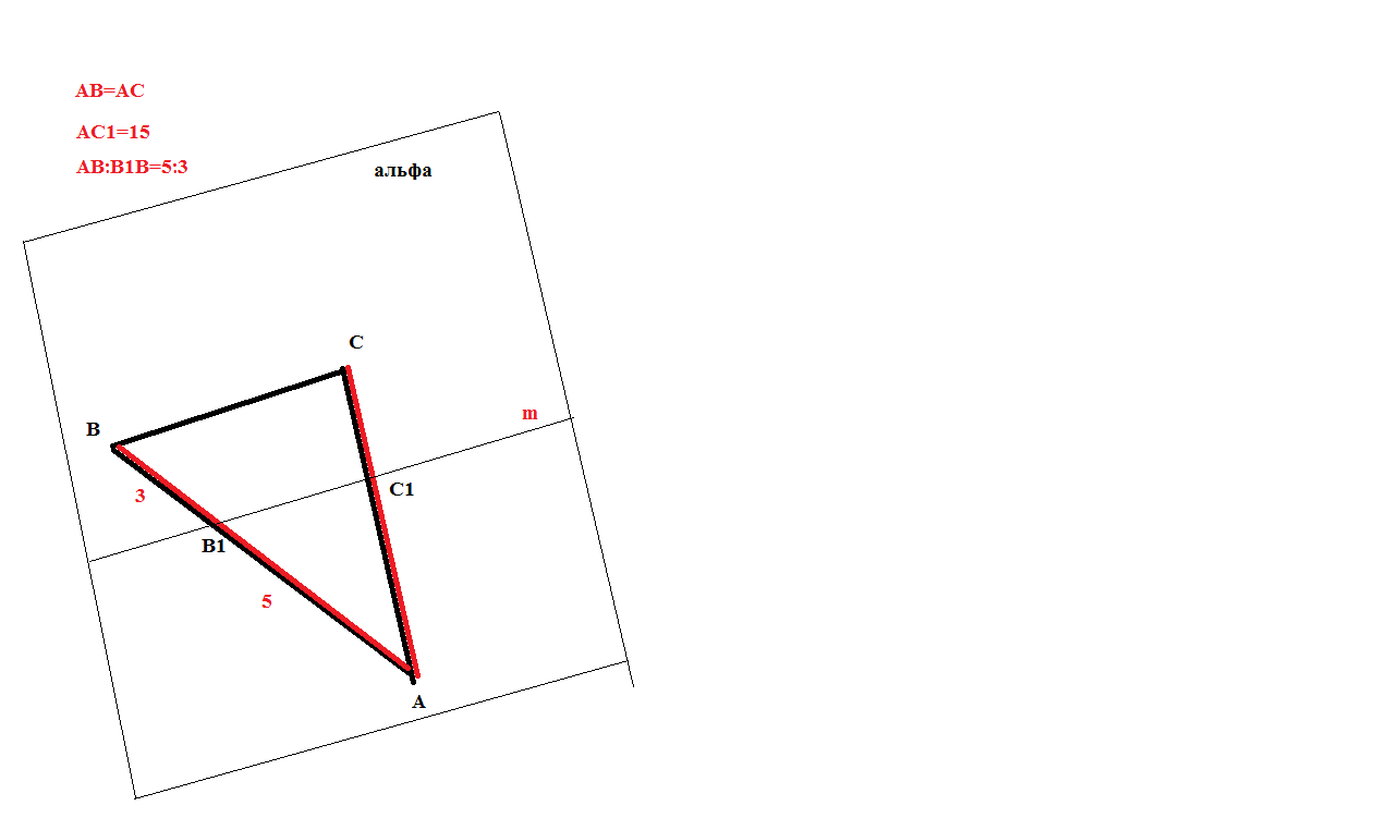 плоскость альфа пересекает стороны треугольника ABC AB=AC соответственно в точках B1 и C1. известно,что BCпараллелен плоскости альфа, AB=B1B= 5:3, AC=15.найти AC1. РИСУНОК ОБЯЗАТЕЛЬНО