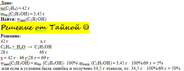Из 42г этилена было получено 3,45г этанола. Сколько процентов это составило от теоретически возможного выхода?