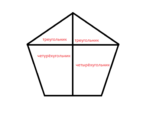 Вот так вот проведи 2 прямые. Получится 2 треугольника и 2 четырёхугольника.