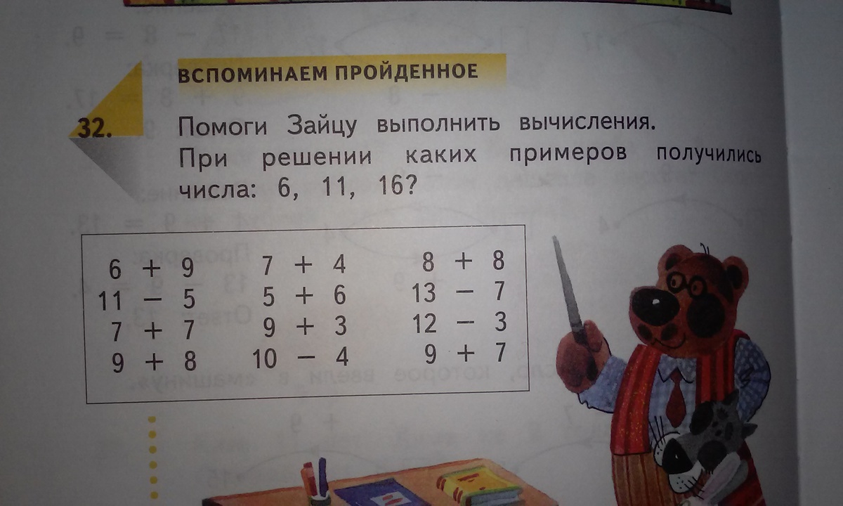 написано.помоги зайцу выполнить вычисления.при решении каких примеров получились числа 6,11,16.и снизу примеры