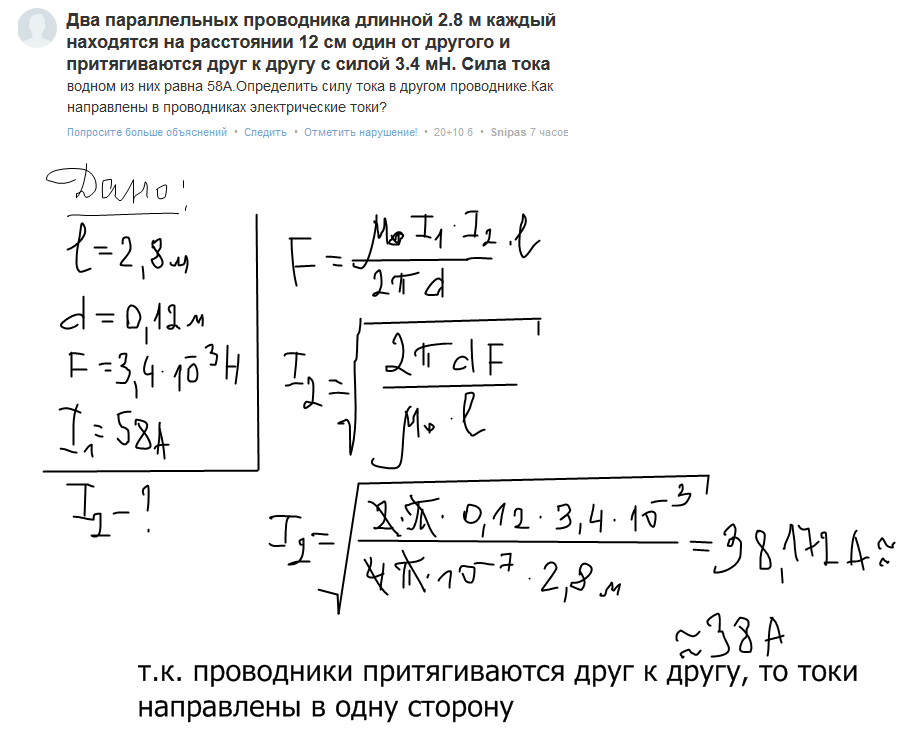 Два параллельных проводника длинной 2.8 м каждый находятся на расстоянии 12 см один от другого и притягиваются друг к другу с силой 3.4 мН. Сила тока водном из них равна 58А.Определить силу тока в другом проводнике.Как направлены в проводниках электрические токи?