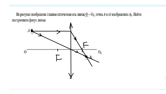 На рисунке изображена главная оптическая ось линзы О – О1, точка А и её изображение А1. Найти построением фокус линзы
