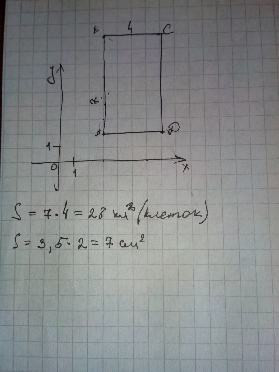 Построй прямоугольник ABCD с вершинами А{3; 2), В (3; 9), С(7; 9), D(7; 2) и найди его площадь (в кв. ед.).
