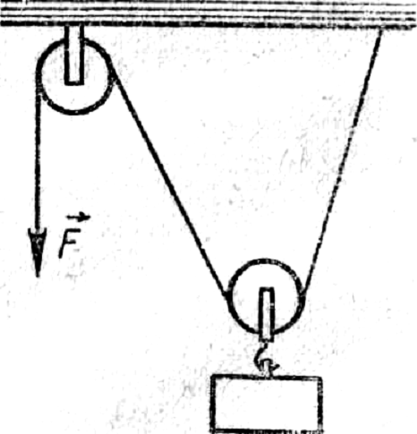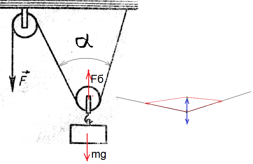 Даст ли подвижный блок в случае, представленном на рисунке, выигрыш в силе в 2 раза? Как изменяется по модулю прикладываемая к тросу сила F по мере поднятия груза? Трение и вес блока не учитывать.