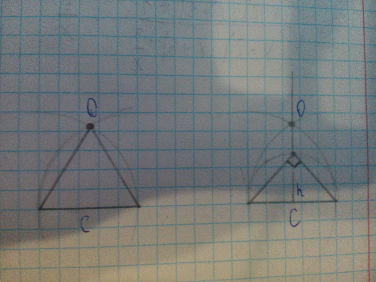 2 треугольник. Рисуем также два полукруга, рисуем высоту через точку пересечения(О) к отрезку С. Тем самым мы нашли центр отрезка С. От центра отрезка (h) мы рисуем полукруг радиусом половины C. Соединяем точку пересечения этого полукруга и высоты к отрезку C, получился равнобедренный прямоугольный треугольник.