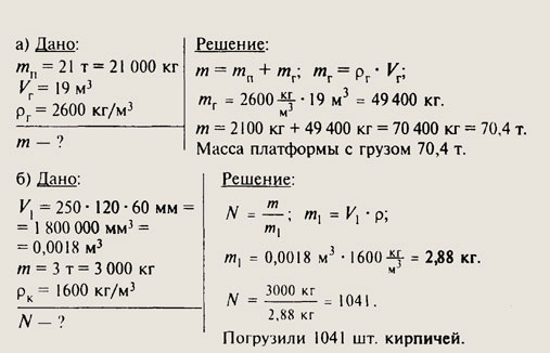 а) На железнодорожную четырехосную платформу массой 21 т погрузили гранит объемом 19 м3. Какой стала общая масса платформы с грузом?б) Сколько штук кирпичей размером 250 X 120 X 60 мм погрузили на автоприцеп, если масса его увеличилась на 3 т?