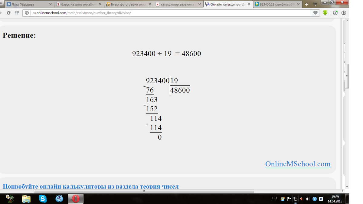 923400:19. берем сначала 4, 92 -76 получается 16 приписываем 3 получается 163 берем 8, 163-152 получается 144 затем берем 6, 114-144=0 итого получается 48600