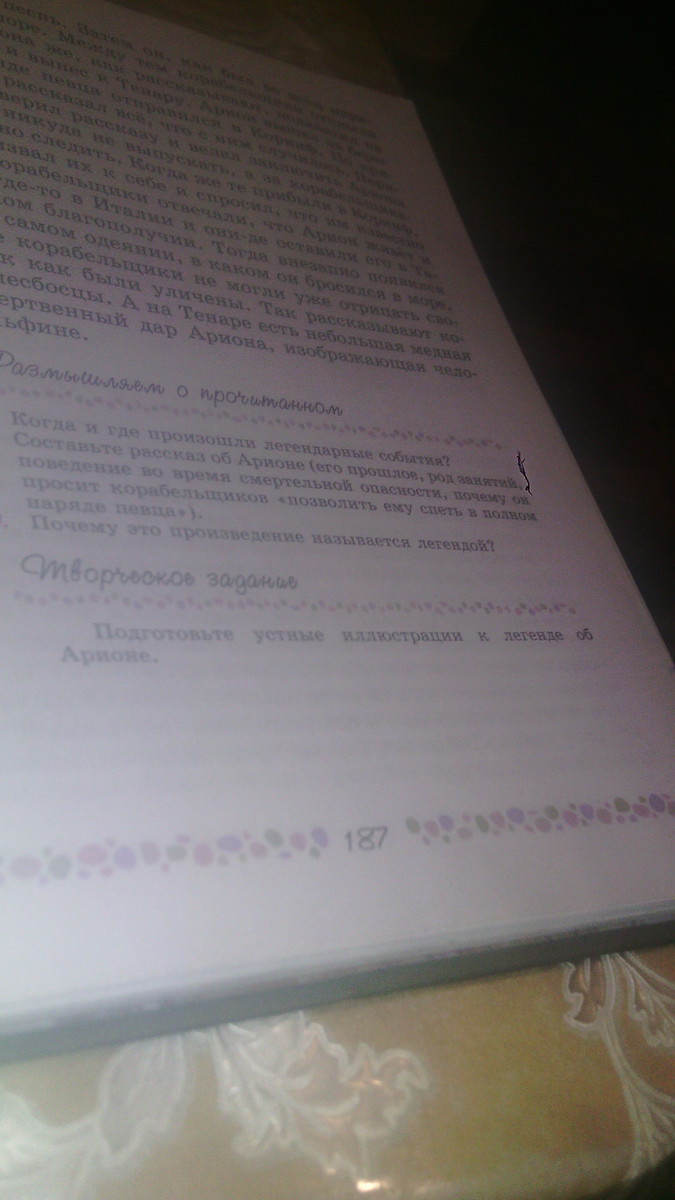 К этой легенде можно нарисовать такую иллюстрацию: греческий корабль, где на носу собрались корабельщики, а на корме с кифарой в руках стоит Арион. Или нарисовать дельфина, который несёт на спине человека в костюме певца.