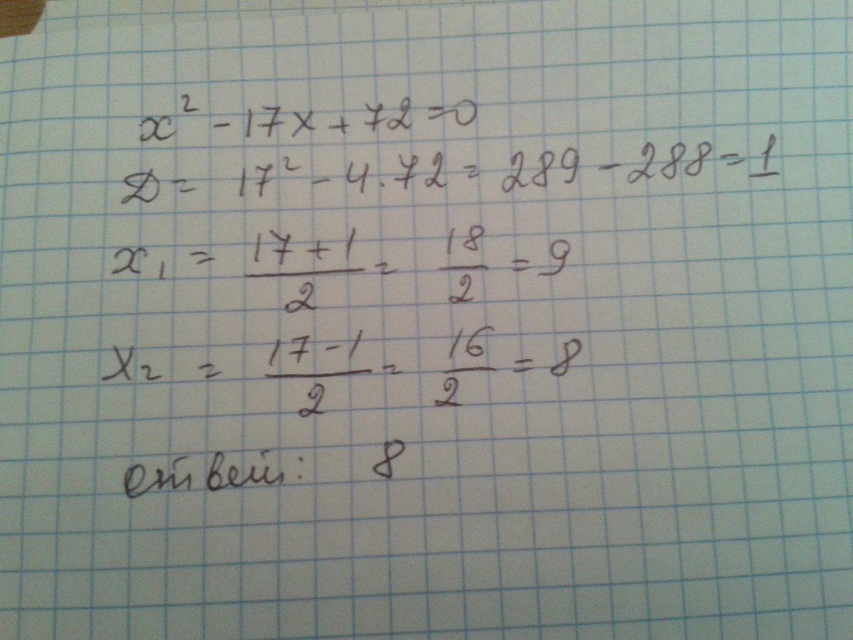 .Найдите корень уравнения:X^2- 17x+72= 0 Если уравнение имеет более одного корня, укажите меньший из них ответ нужен с решением