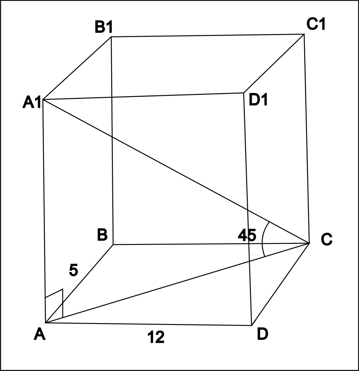 в прямоугольном параллелепипеде стороны основания равны 12см и 5см. диагональ параллелепипеда образует с плоскостью основания угол в 45°. найдите боковое ребро параллелепипеда.