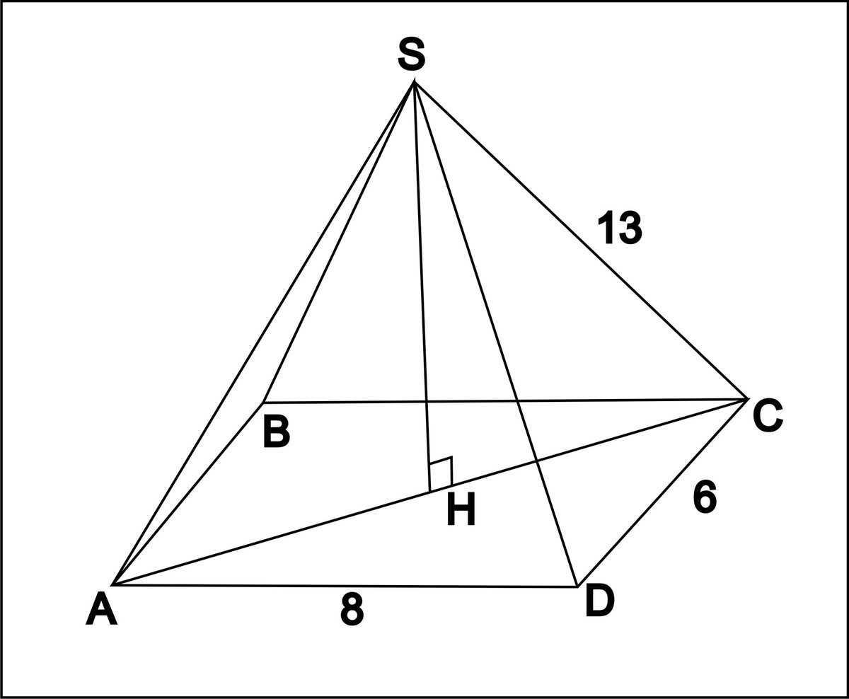 основания пирамиды-прямоугольник со сторонами 6 см и 8 см.каждое боковое ребро пирамиды равно 13 см.вычислите высоту пирамиды
