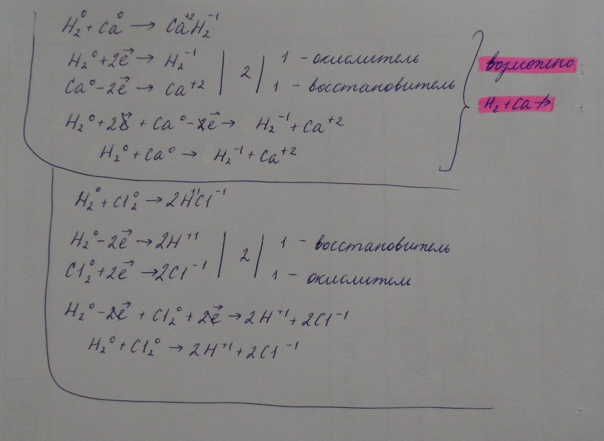 допишите уравнение реакции,расставив коэффициенты в них методом электронного баланса.Назовите продукты реакций.Укажите ,в каких из реакций водород-окислитель,а в каких -восстановитель. H2+K... H2+N2... H2+CuO... H2+O2... H2+Ca... H2 =+Cl2... ?????????