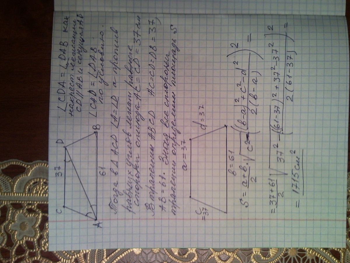 Основания равнобокой трапеции 37см и 61см,а диагональ делит ее острый угол пополам.Найти площадь трапеции.