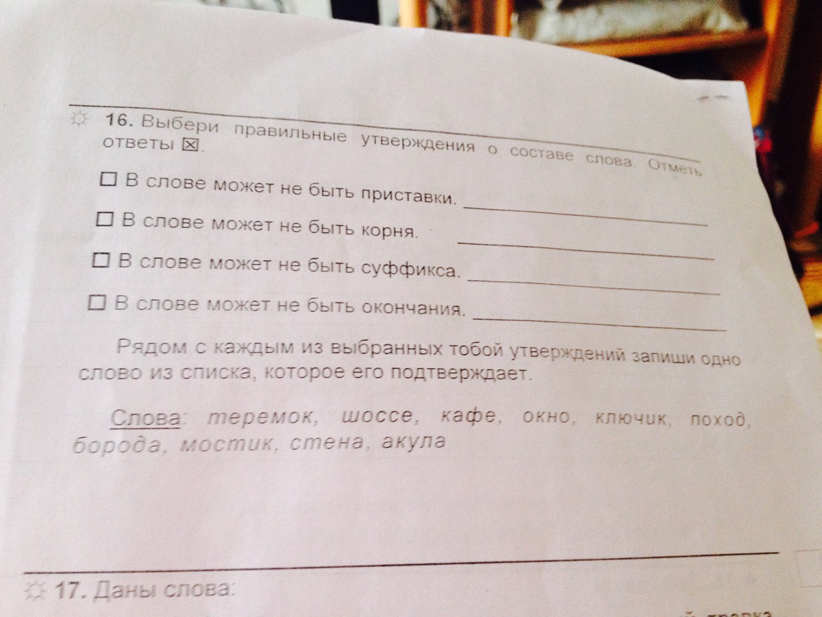 в слове не может быть приставки _да - кафе,борода в слове не может быть корня_нет - в слове не может быть суффикса_ да -акула,окно,шоссе в слове не может быть окончания_ да -теремок, мостик, ключик