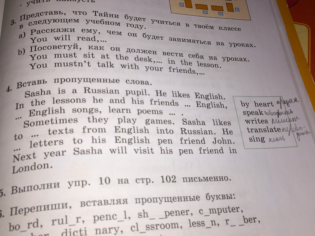1)Speak 2)sing 3)by heart 4)translate 5)write
