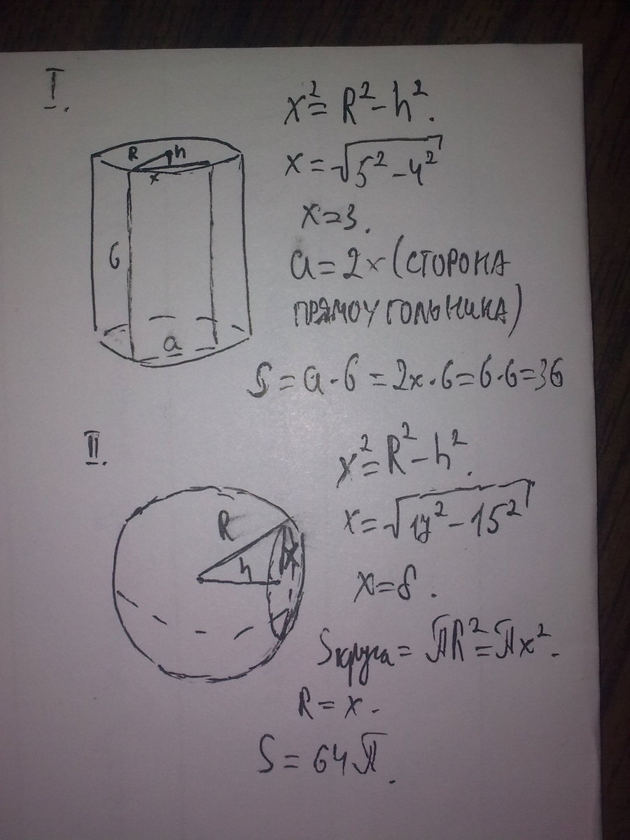 Помогите решить эти задачи самое главное что бы были рисунки к эти задачам прошу вас помогите скорее Радиус основания цилиндра равен 5 см, а высота цилиндра равна 6см. Найдите площадь сечения, проведенного параллельно оси цилиндра на расстоянии 4см от нее. 2.Радиус шара равен 17см. Найдите площадь сечения шара, удаленного от его центра на 15см. 3.Радиус основания конуса равен 3м, а высота 4м. Найдите образующую и площадь осевого сечения.