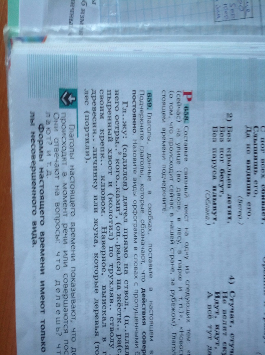 Гляжу:садится дятел прямо на ствол,цепляется за него острыми коготками опирается на жесткий растопыренный хвост и колит по трухлявому стволу дерева своим крепким клювом.Наверное,выискал в гнилой древесине личинку или жука,которые деревья точат(подчеркнуть 2 линиями),лес портят(подчеркнуть 2 линиями)
