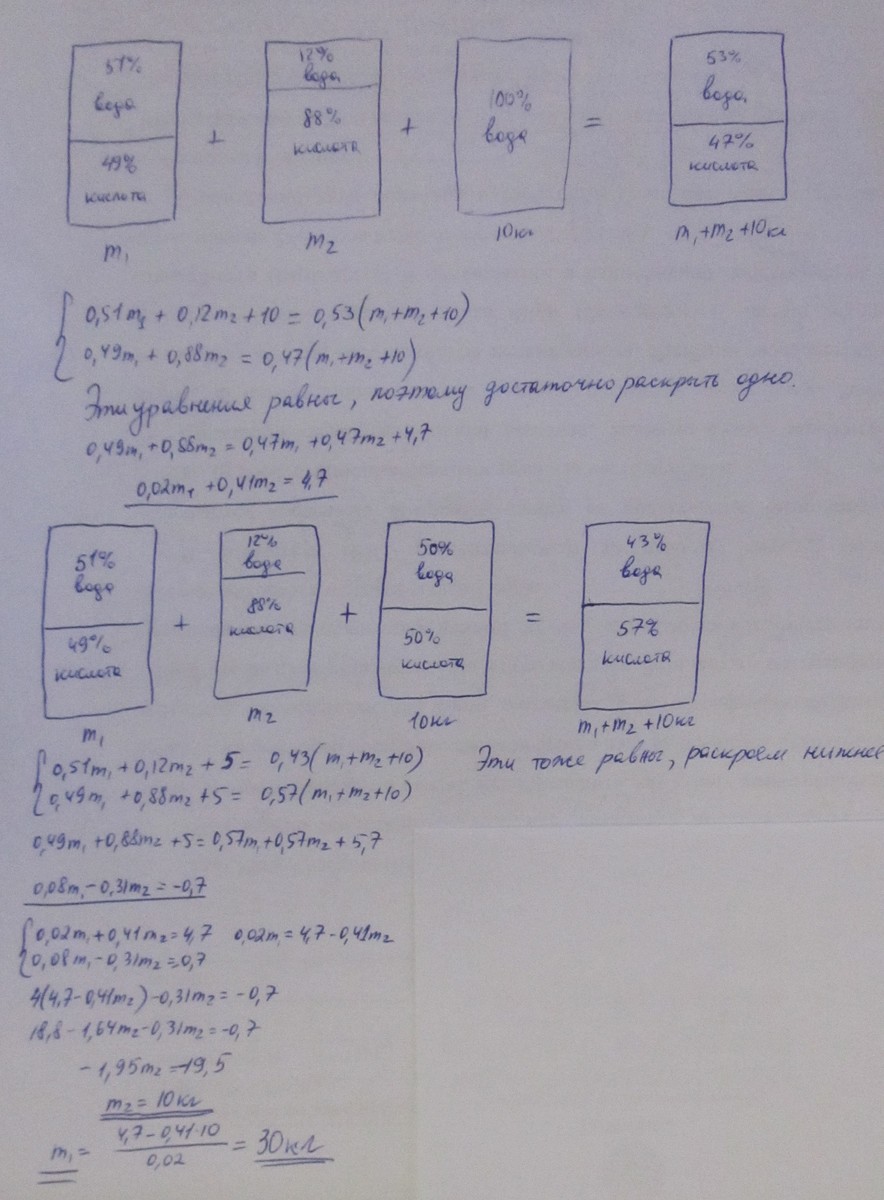 Смешав 49-процентный и 88-процентный растворы кислоты и добавив 10 кг чистой воды, получили 47-процентный раствор кислоты. Если бы вместо 10 кг воды добавили 10 кг 50-процентного раствора той же кислоты, то получили бы 57-процентный раствор кислоты. Сколько килограммов 49-процентного раствора использовали для получения смеси?