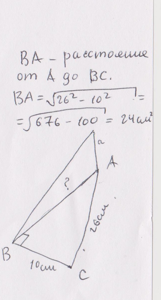 через вершину острого угла А прямоугольного треугольника ABC (^ B = 90) проведена прямая a перпендикулярно плоскости треугольника. Найти расстояние между прямыми BC и a, если BC = 10 см и AC = 26 см