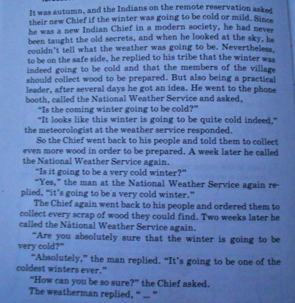 Это было осенью, и индейцы на пульте дистанционного бронирования спросил своего нового начальника, если зима будет холодной или мягкий. Так как он был новый индейского вождя в современном обществе, он никогда не учили старые тайны, и когда он посмотрел на небо, он не мог сказать, что погода была и будет. Тем не менее, чтобы быть на безопасной стороне, он ответил своему племени, что зима действительно будет холодно и что жители деревни должны собирать дрова, чтобы быть готовым. Но также практический лидер, после нескольких дней он получил идею. Он подошел к телефонной будке, под названием Национальная служба погоды и спросил,"Является ли приход зимы будет холодно?""Похоже, этой зимой будет очень холодно действительно," ответил метеоролог службы погоды.Так главный вернулся к своему народу и сказал им, чтобы собрать еще больше древесины для того, чтобы быть готовым. Неделю спустя он снова позвонил Национальная служба погоды."Это собирается быть очень холодно зимой?""Да," человек в Национальной метеорологической службы снова ответил, что "это будет очень холодно зимой."Главный снова вернулся к своим людям и приказал им собрать каждый клочок леса они могли найти. Две недели спустя он снова позвонил Национальная служба погоды."Вы абсолютно уверены, что зима будет очень холодной?""Безусловно," ответил человек. "Это будет одним из самых холодных зим в истории.""Как вы можете быть так уверены?" спросил шеф.Метеоролог ответил: "Индейцы собирают дрова, как сумасшедший!"