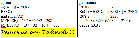 К раствору содержащему 20,8 г хлорида бария добавили раствор серной кислоты. Найдите массу выпавшего в остаток сульфата бария ВаSO4. (Пожалуйста с дано и подробным решением)