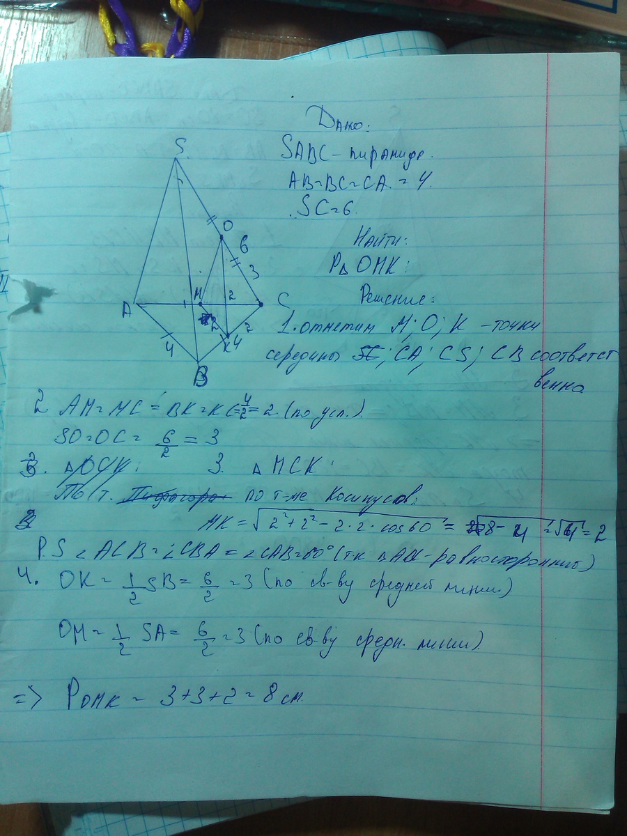 Сторона основание правильной треугольной пирамиды равна 4, а боковое ребро равно 6. Найдите периметр сечения, проходящего через середины трех ребер, имеющих общую вершину основания.