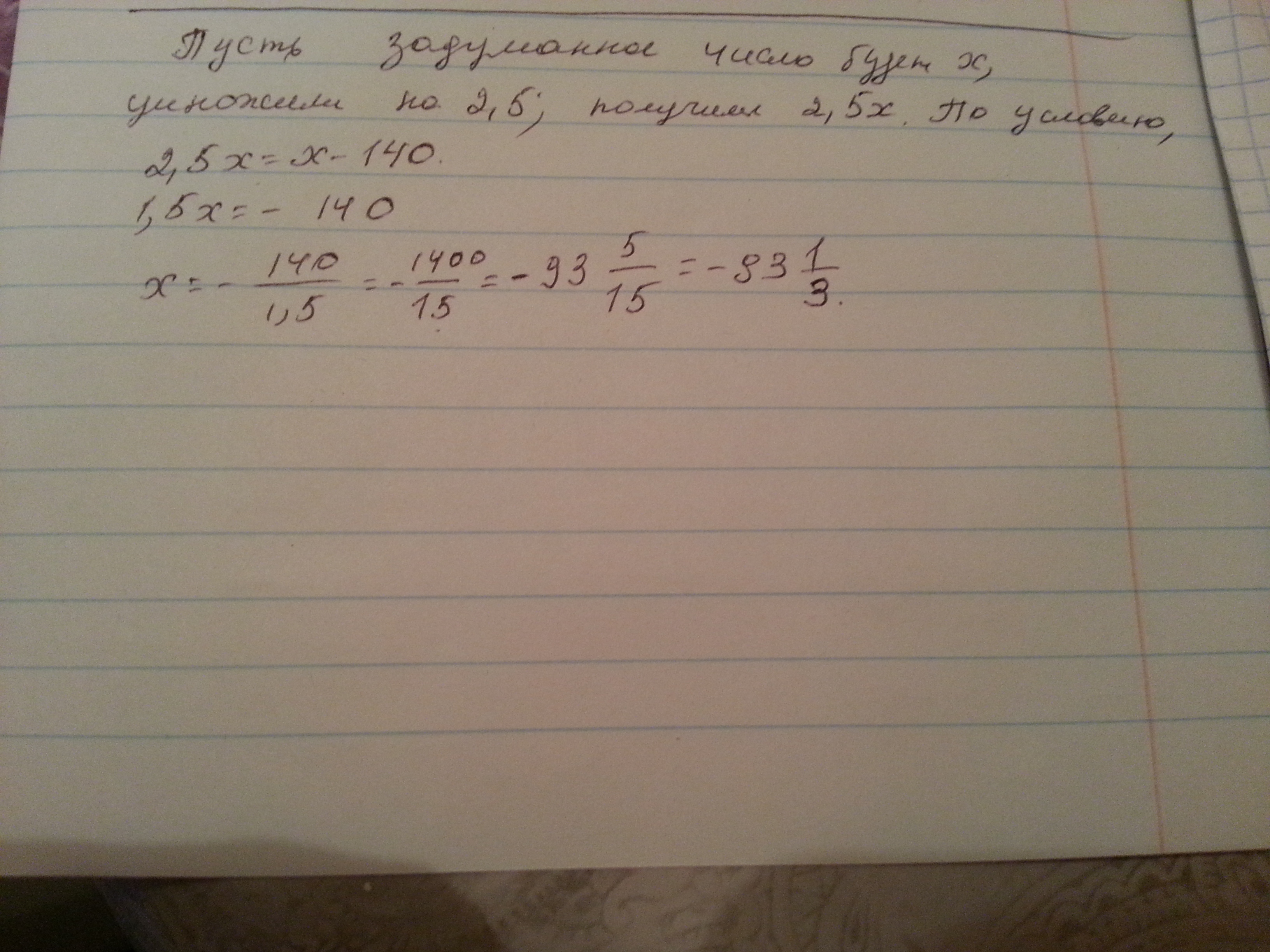 Задуманное число умножили на 2,5 и получили столько же, как если бы вычли 140 . Какое число задумали?