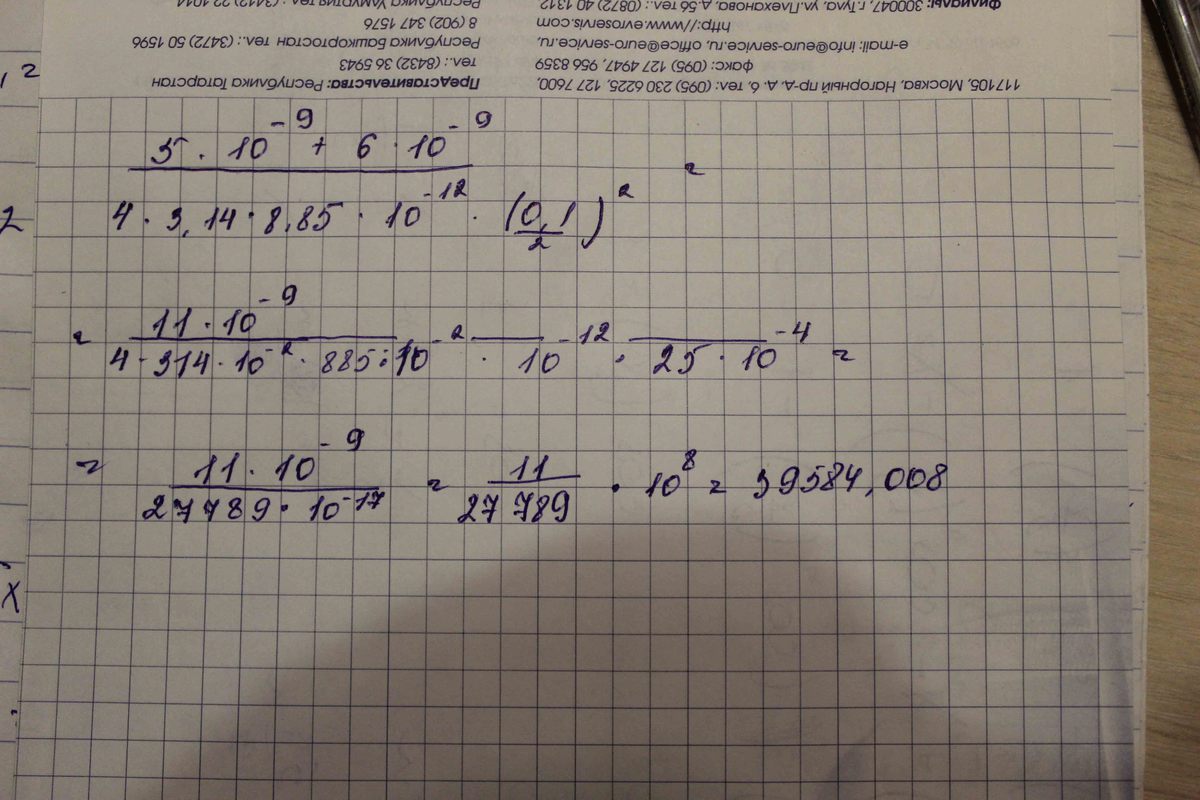 (5+6)*10⁻⁹/(4*3,14*8,85*10⁻¹²*(10⁻²/4))≈11*10⁻⁹/(27,79*10⁻¹⁴)≈0,4*10⁵≈4*10⁴.