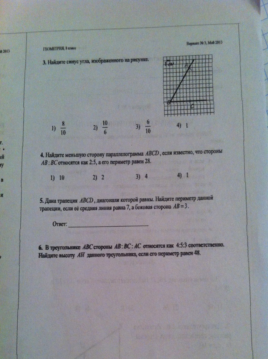 Ну, тогда я решу 4 задание! ) Периметр параллелограмма равен сумме его сторон, а т. к. у параллелограмма противолежащие стороны равны (по Т.6.3), то периметр данного параллелограмма составит 2 (АВ+ВС) = 28 ед. (по условию). Тогда АВ+ВС =14 (ед.). По условию задачи АВ:ВС = 2:5, т.е 7 частей составит 14 ед., а одна часть - 2 ед. Отсюда найдём искомую меньшую сторону параллелограмма: АВ = 2*2 = 4 (ед.). Ответ - 3.