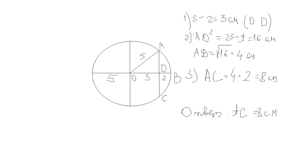 радиус ов окружности с центром в точке о пересекает хорду АС в точке D и перпендикулярно ей. найдите длину хорды АС если BD =2 см а радиус окружности 5 см.