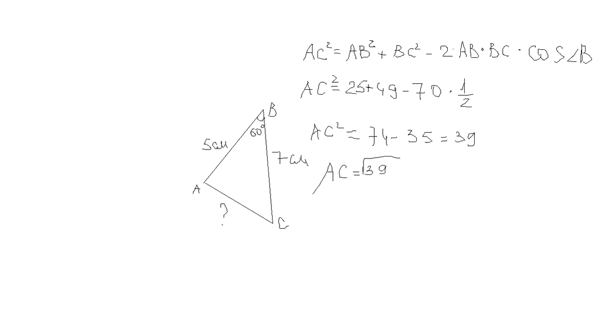1. Две стороны треугольника равны 5см и 7см, а угол между ними равен 60(градусов). Найти третью сторону треугольника.