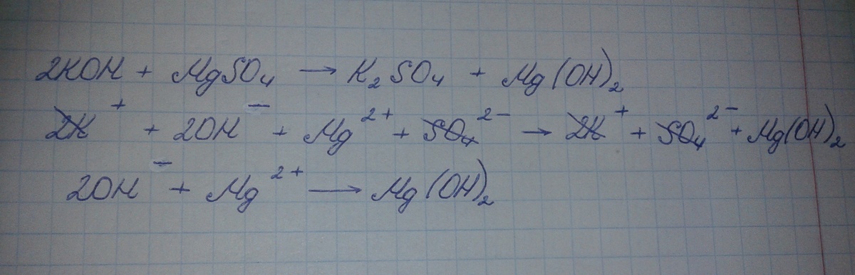 Составить уравнение ионного обмен (Рио)в молекулярной, полной ионной и сокращенной ионной формах KOH+Mg SO4->K2SO4+Mg(OH)2