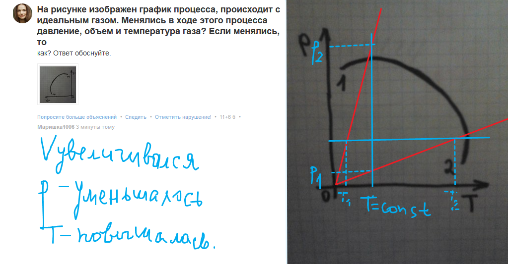 На рисунке изображен график процесса, происходит с идеальным газом. Менялись в ходе этого процесса давление, объем и температура газа? Если менялись, то как? Ответ обоснуйте.