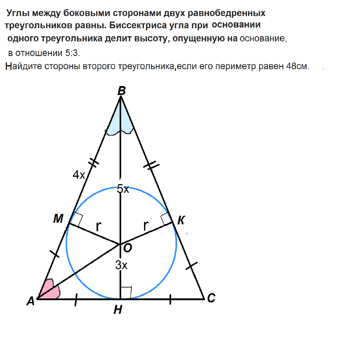 Углы между боковыми сторонами двух равнобедренных треугольников равны. Биссектриса угла при основании одного треугольника делит высоту, опущенную на основание, в отношении 5:3. найдите стороны второго треугольника если его периметр равен 48см.