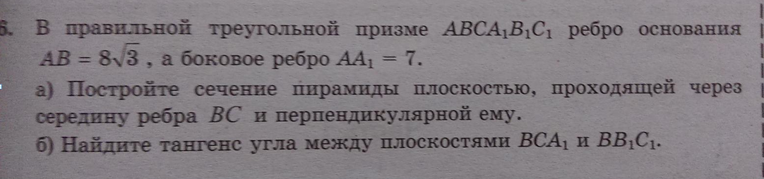 а) постройте плоскость сечения призмы, проходящей через середину ребра ВС и перпендикулярного ему.