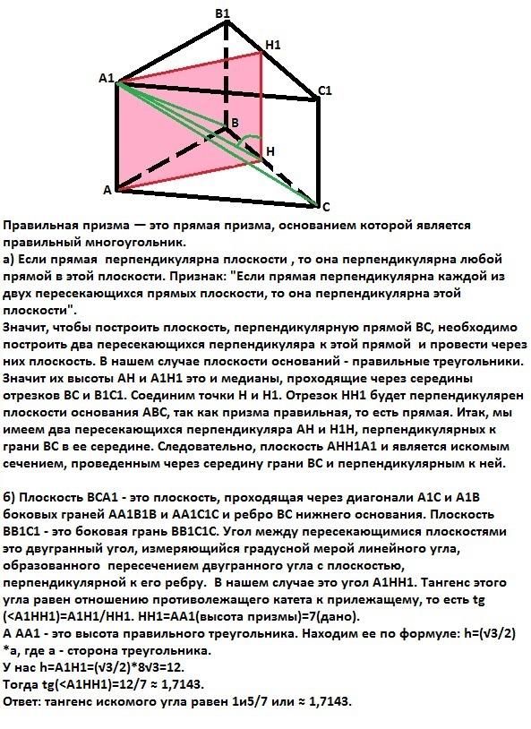 б) Плоскость ВСА1 - это плоскость, проходящая через диагонали А1С и А1В боковых граней АА1В1В и АА1С1С и ребро ВС нижнего основания. Плоскость ВВ1С1 - это боковая грань ВВ1С1С. Угол между пересекающимися плоскостями это двугранный угол, измеряющийся градусной мерой линейного угла, образованного пересечением двугранного угла с плоскостью, перпендикулярной к его ребру. В нашем случае это угол А1НН1. Тангенс этого угла равен отношению противолежащего катета к прилежащему, то есть tg(<А1НН1)=A1H1/HH1. НН1=АА1(высота призмы)=7(дано).