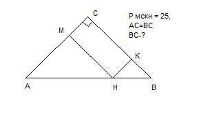 в равнобедренный прямоугольный треугольник вписан прямоугольник таким образом, что он имеет с треугольником общий прямой угол. периметр этого прямоугольника равен 25 см. найдите катет треугольника