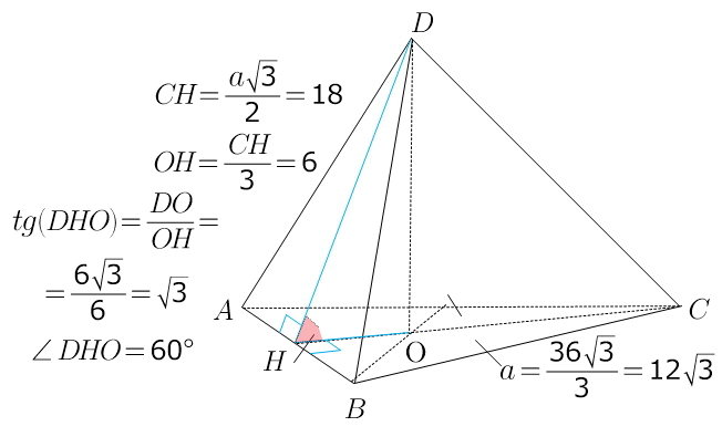 Найдите величину двугранного угла при ребре основания правильной пирамиды DABC с периметром основания 36√3 и высотой 6√3.