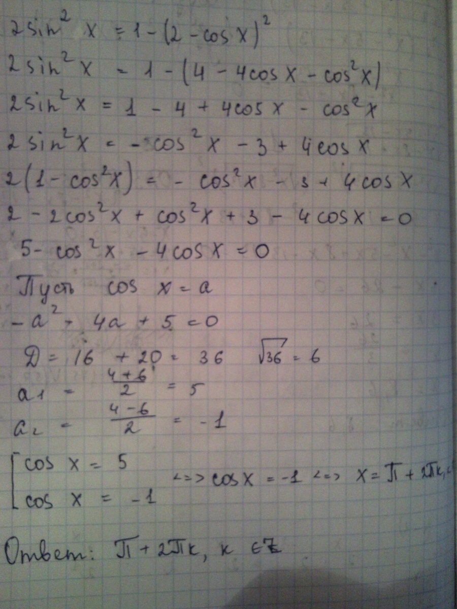 2sin^2x=1-(2-cosx)^2 Решение во вложении: