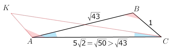 AC --самая большая сторона треугольника АВС ---> угол АВС--самый большой и он равен углу КАС (это тупые углы треугольников)))