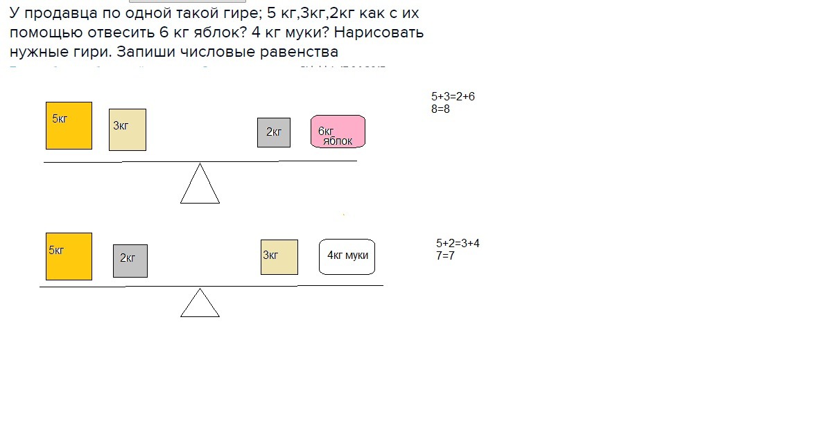 У продавца по одной такой гире; 5 кг,3кг,2кг как с их помощью отвесить 6 кг яблок? 4 кг муки? Нарисовать нужные гири. Запиши числовые равенства