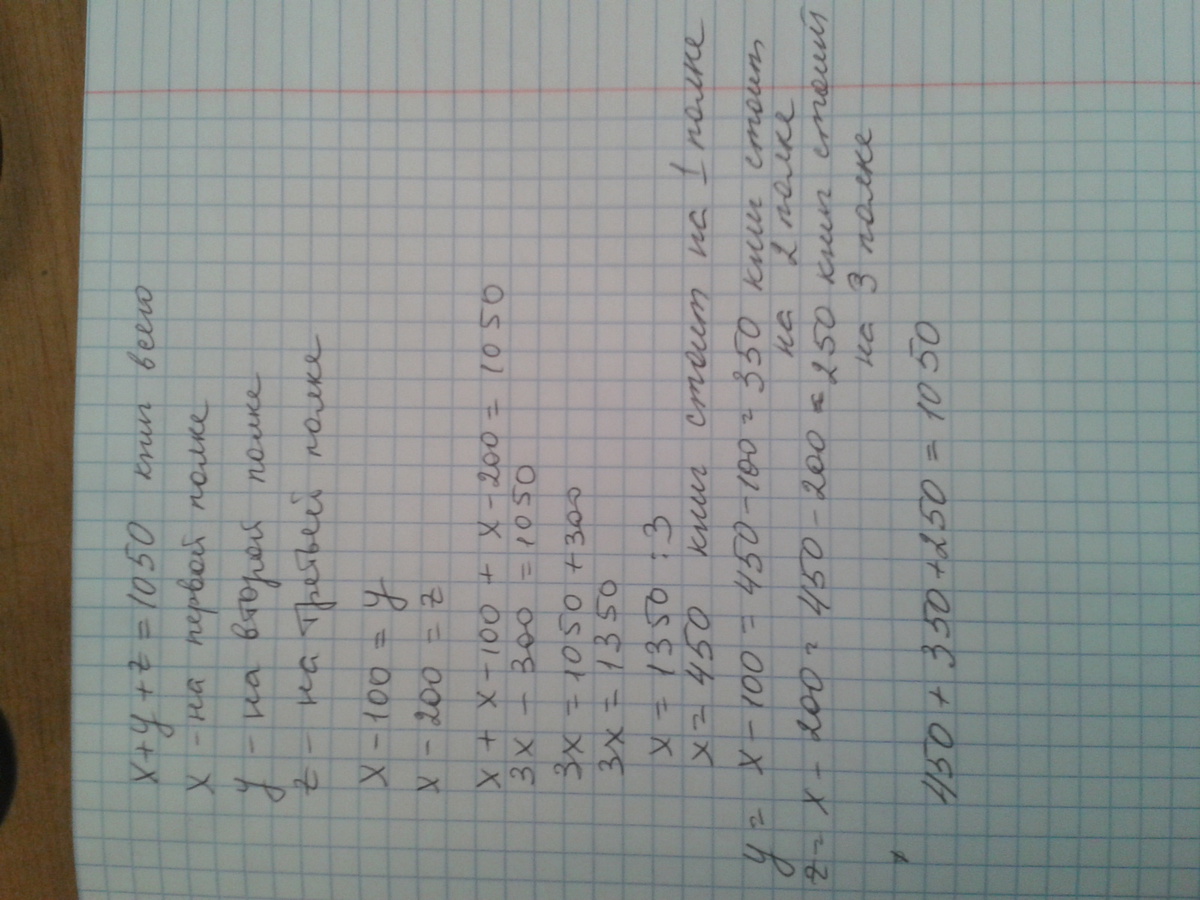 На трех книжных полках стоит 1050 книг,причем на первой полке стоит на 100 книг больше,чем на второй,и на 200 книг больше,чем на третьей.Сколько книг на каждой из полок?