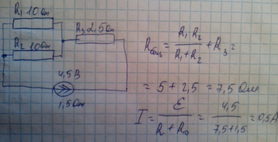 паралельно третьего проводника сопротивлением 2.5 ом подключенного к ним последовательно. Чему равна сила тока в цепи ? выполните рисунок схемы электрической цепи!