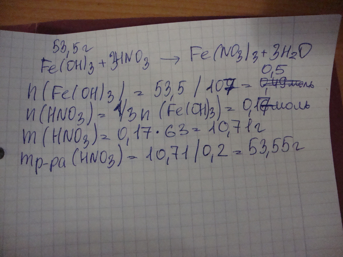 Какая масса 20 %-ного раствора азотной кислоты необходима для растворения 53,5 г гидроксида железа (III)?